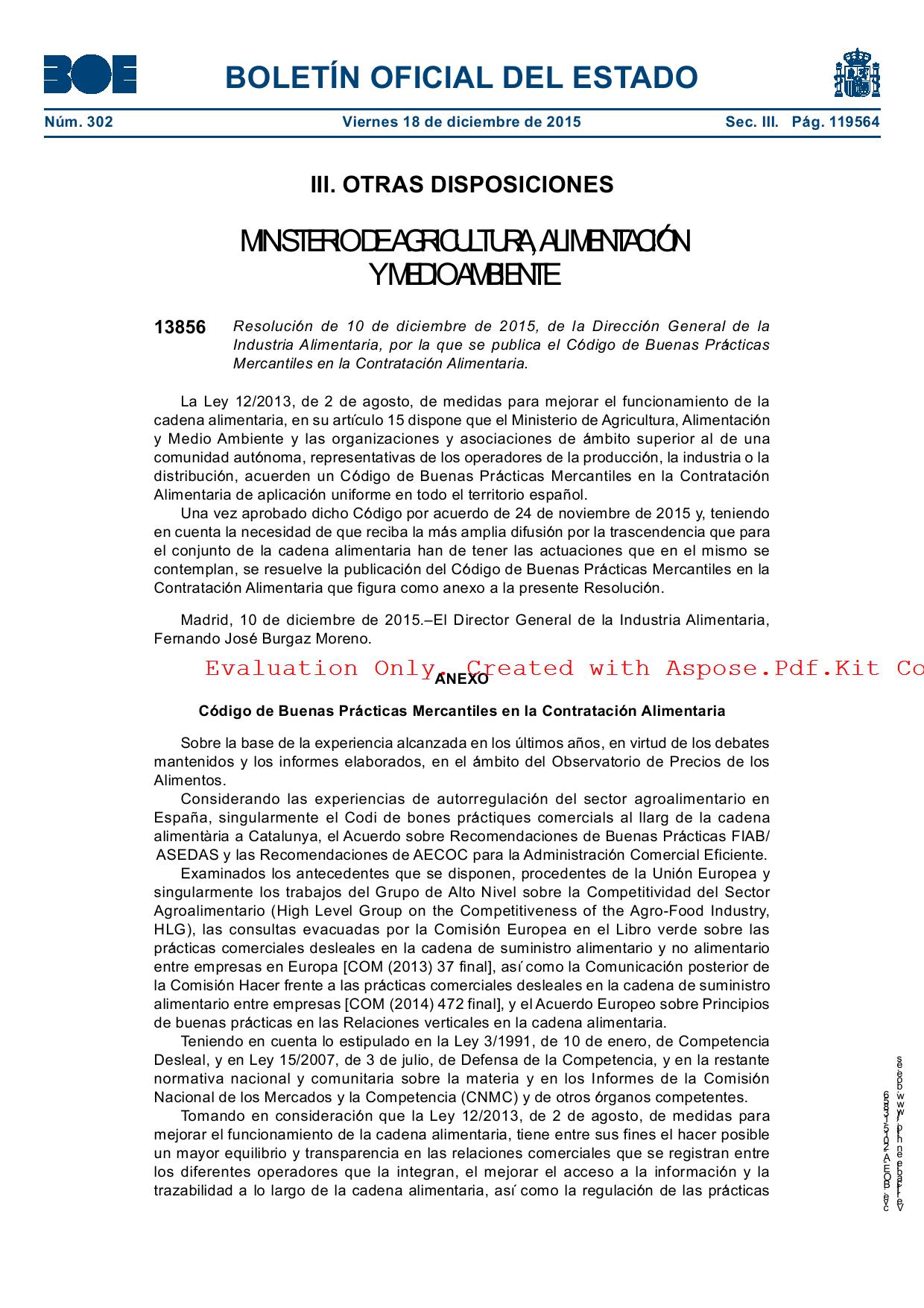 La Ley 12/2013, de 2 de agosto, de medidas para mejorar el funcionamiento de la cadena alimentaria, en su artículo 15 dispone que el Ministerio de Agricultura, Alimentación y Medio Ambiente y las organizaciones y asociaciones de ámbito superior al de una comunidad autónoma, representativas de los operadores de la producción, la industria o la distribución, acuerden un Código de Buenas Prácticas Mercantiles en la Contratación Alimentaria de aplicación uniforme en todo el territorio español.