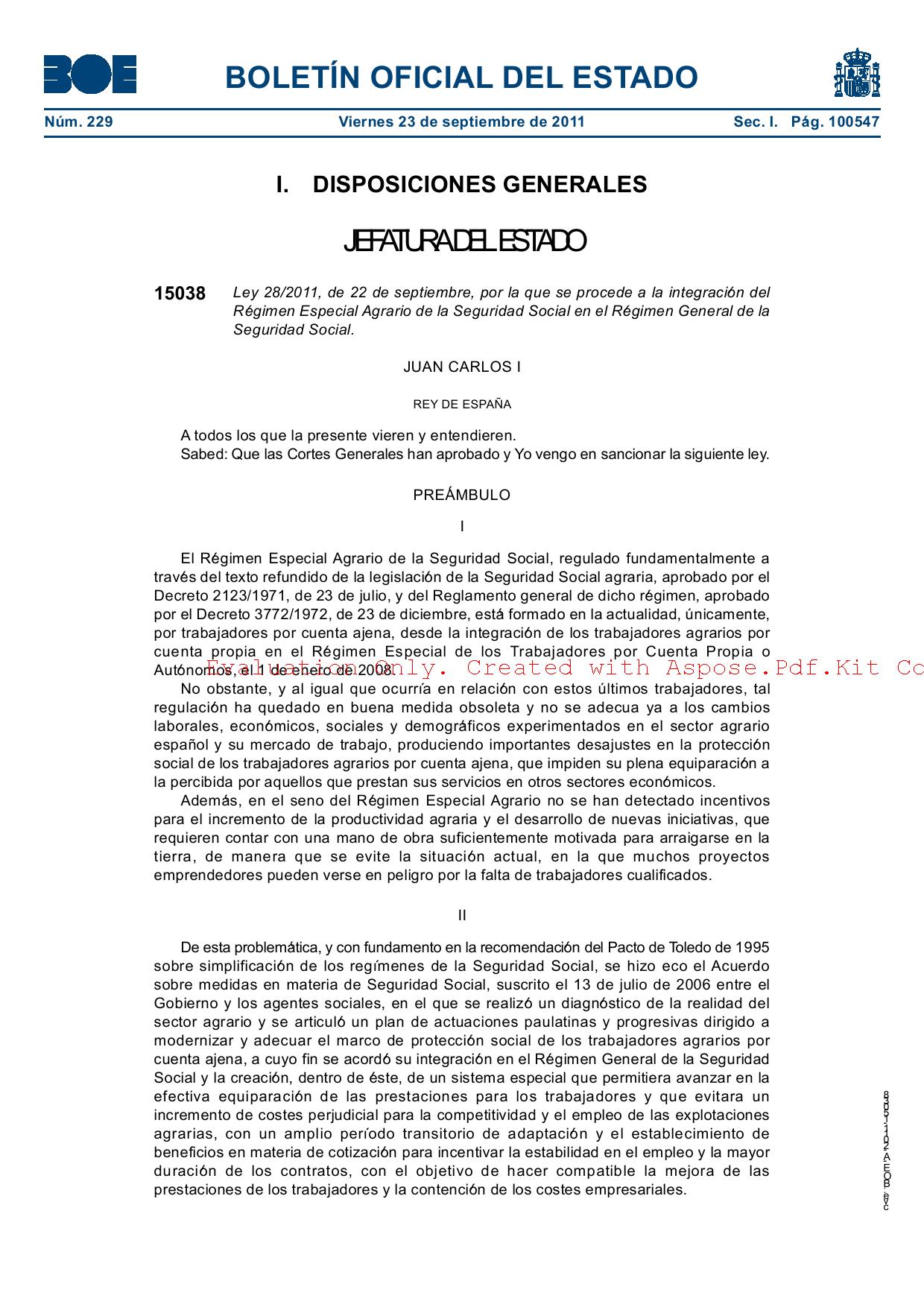 Ley 28/2011, de 22 de septiembre, por la que se procede a la integración del Régimen Especial Agrario de la Seguridad Social en el Régimen General de la Seguridad Social