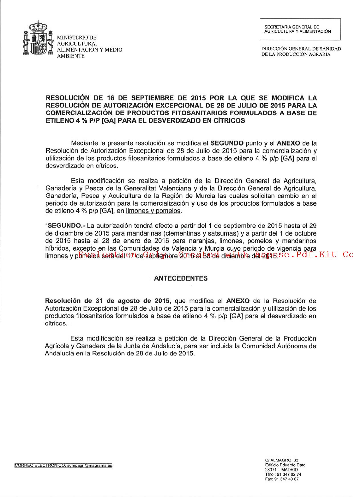 Esta autorización tiene validez desde el 1 de septiembre hasta el 29 de diciembre de 2015, para mandarinas (clementinas y satsumas); y desde el 1 de octubre de 2015 hasta el 28 de enero de 2016, para naranjas, limones, pomelos y mandarinos híbridos, excepto en las Comunidades de Valencia y Murcia para limones y pomelos que será del 17 de septiembre al 30 de diciembre de 2015.