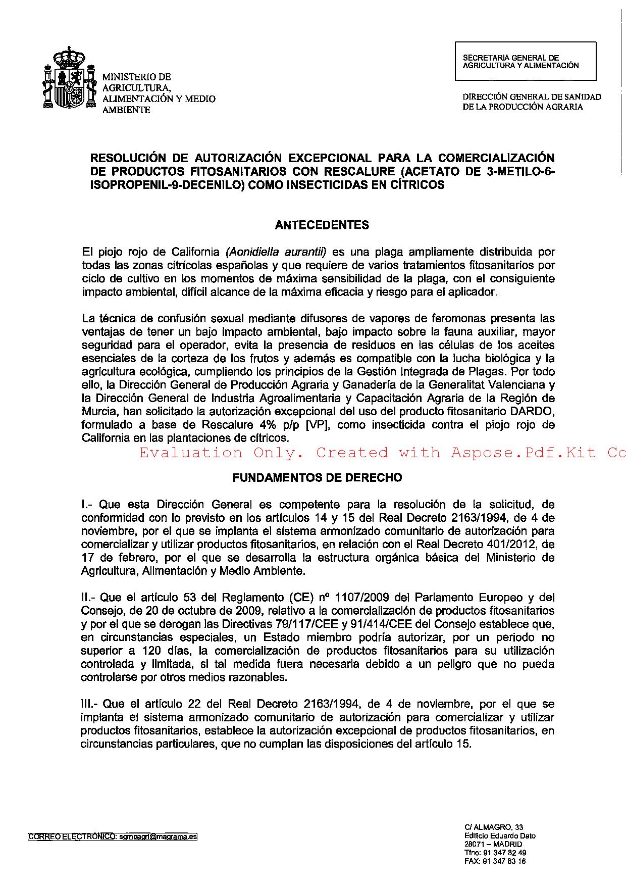 La Dirección General de Sanidad de la Producción Agraria del Ministerio de Agricultura, Alimentación y Medio Ambiente ha concedido una autorización excepcional del formulado comercial a base de rascalure 4% p/p para el control del piojo rojo de California mediante confusión sexual, desde el 8 de marzo al 5 de julio de 2013.
