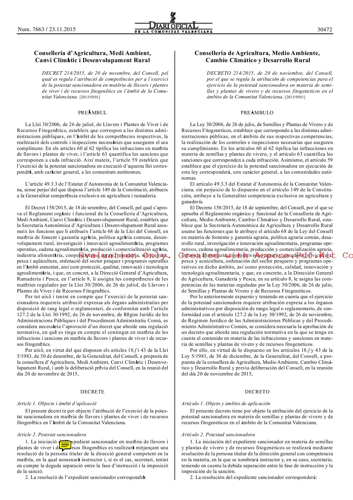 DECRETO 214/2015, de 20 de noviembre, del Consell, por el que se regula la atribución de competencias para el ejercicio de la potestad sancionadora en materia de semillas y plantas de vivero y de recursos fitogenéticos en el ámbito de la Comunitat Valenciana.
