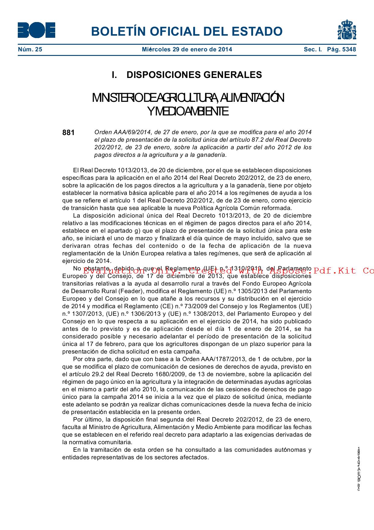 Orden AAA/69/2014, de 27 de enero, que modifica el plazo de presentación de la solicitud única para 2014.