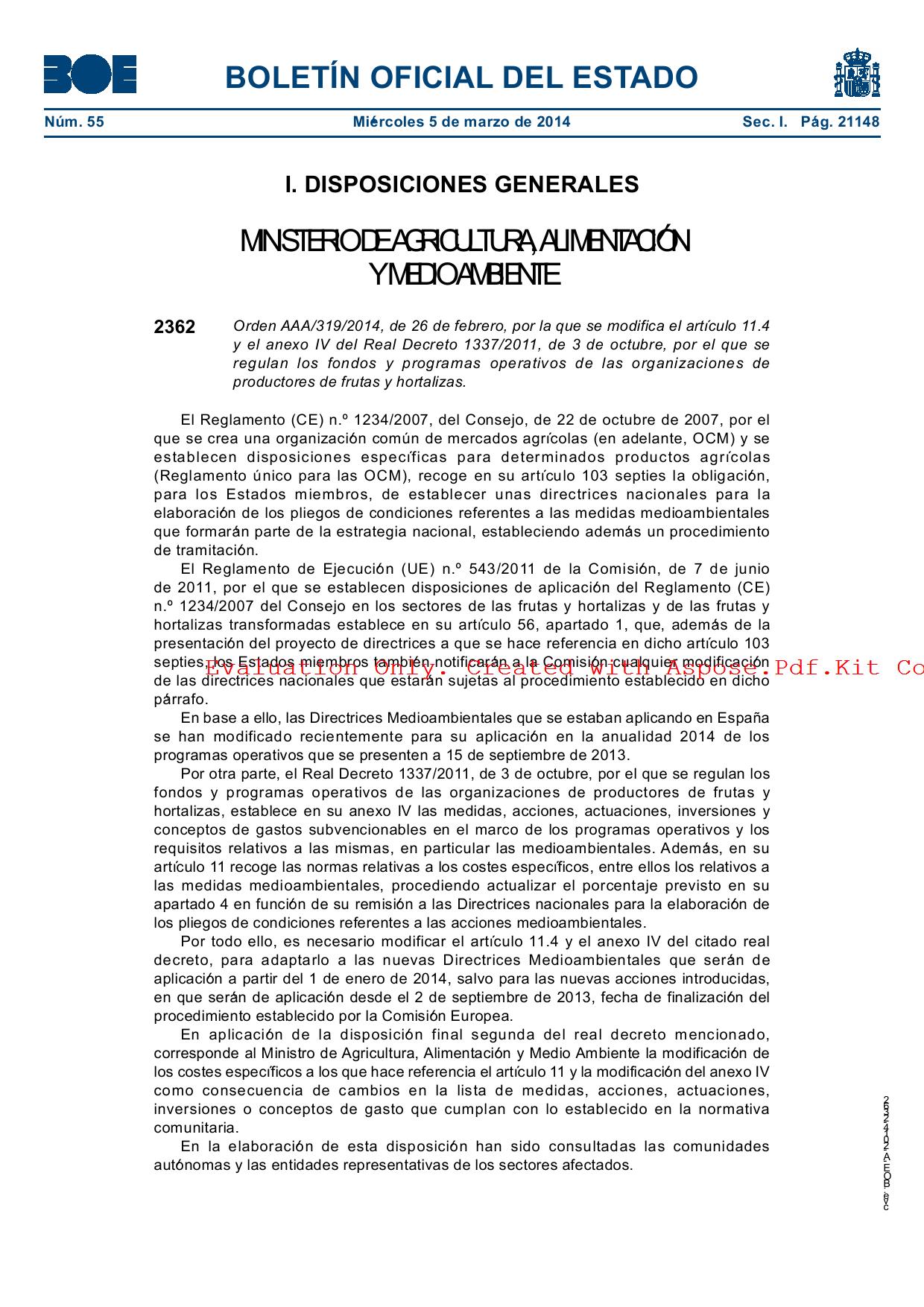 Orden AAA/319/2014, de 26 de febrero, por la que se modifica el artículo 11.4 y el anexo IV del Real Decreto 1337/2011, de 3 de octubre, por el que se regulan los fondos y programas operativos de las organizaciones de productores de frutas y hortalizas.