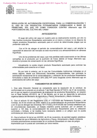 Se adjunta Resolución de la Dirección General de Sanidad de la Producción Agraria del Ministerio de Agricultura, Pesca y Alimentación, de autorización excepcional para la comercialización y el uso de los productos fitosanitarios formulados a base de pirimetanil 30% [GE] P/P como fungicida contra enfermedades de postcosecha del caqui, autorizado únicamente en las Comunidades autónomas de Valencia y Andalucía Período de vigencia de la autorización: a partir del 1 de noviembre y hasta el 31 de diciembre de 2018, ambos inclusive.